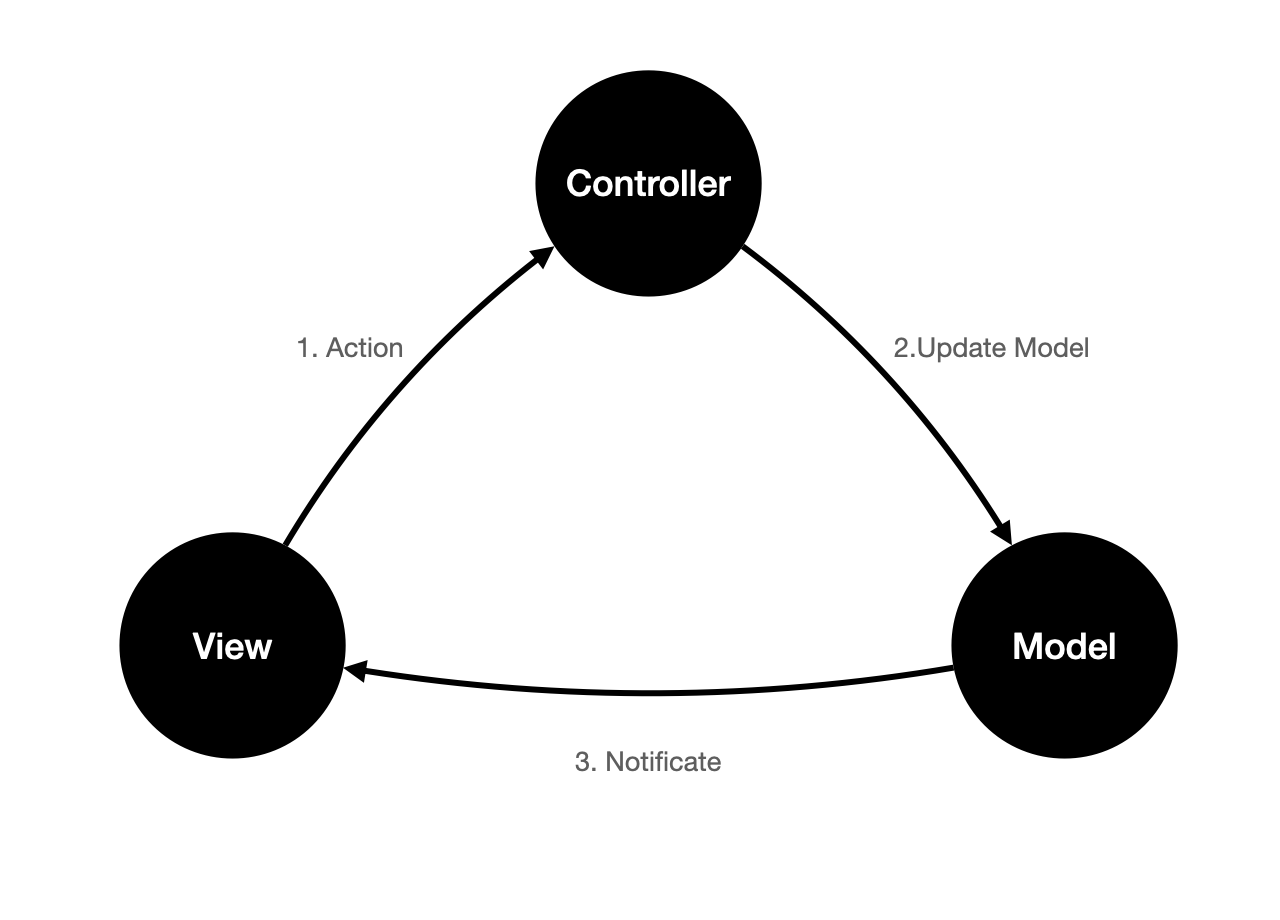 View를 통해 유저는 Action을 발생시킨다. 그 Action을 View 는 컨트롤러에 전달, 컨트롤러는 그것을 확인하여 모델의 업데이트를 진행하고, 업데이트 된 내용을 모델이 뷰로 Notification을 준다. 가장 간단하고 직관적인 흐름인 것 같다.