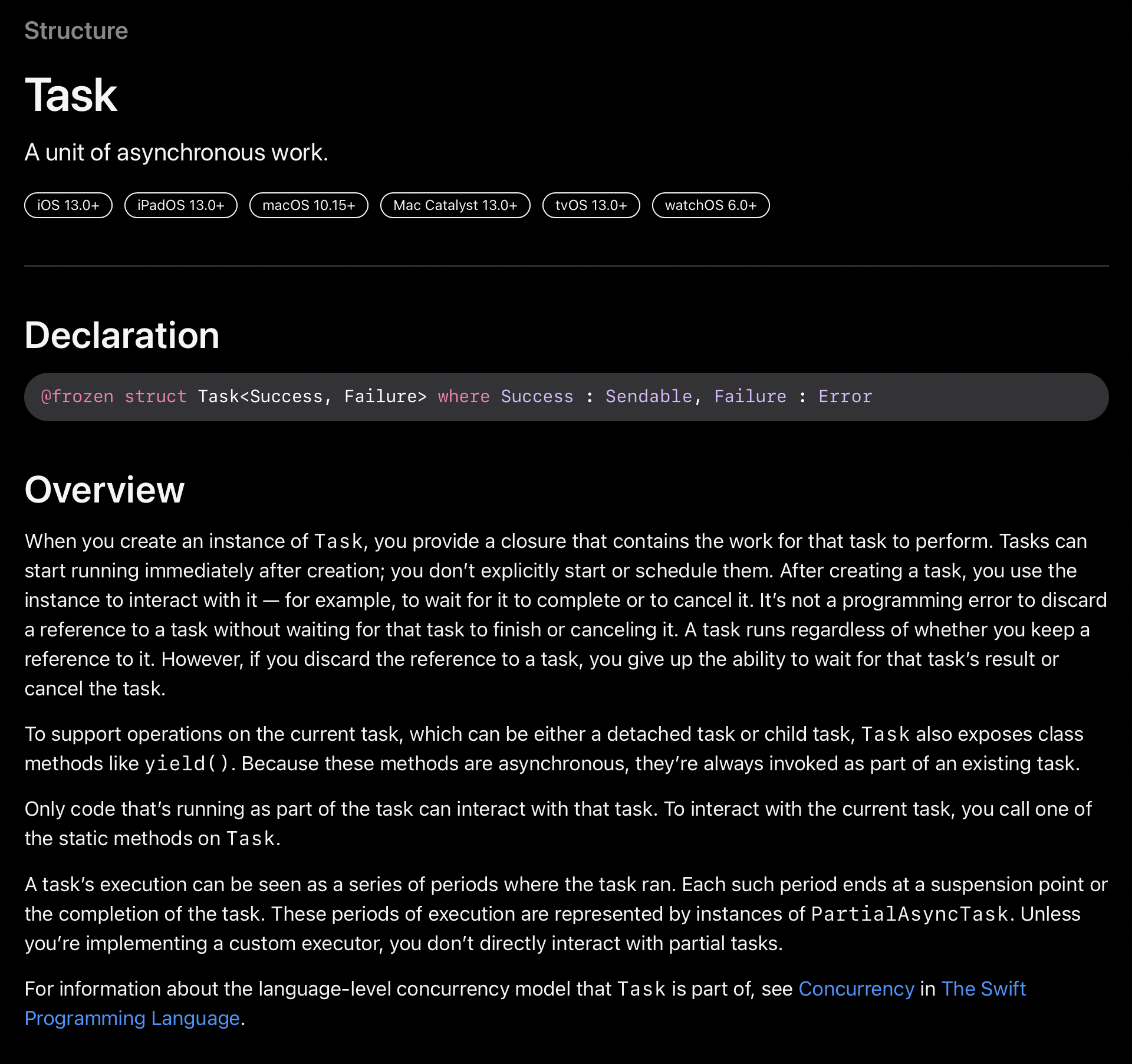 그것은 바로 Task 이다. wwdc21 Meet async/await in Swift 에서 말하길 Task 를 만나면 가용한 thread 에 작업을 할당해 준다고 한다.