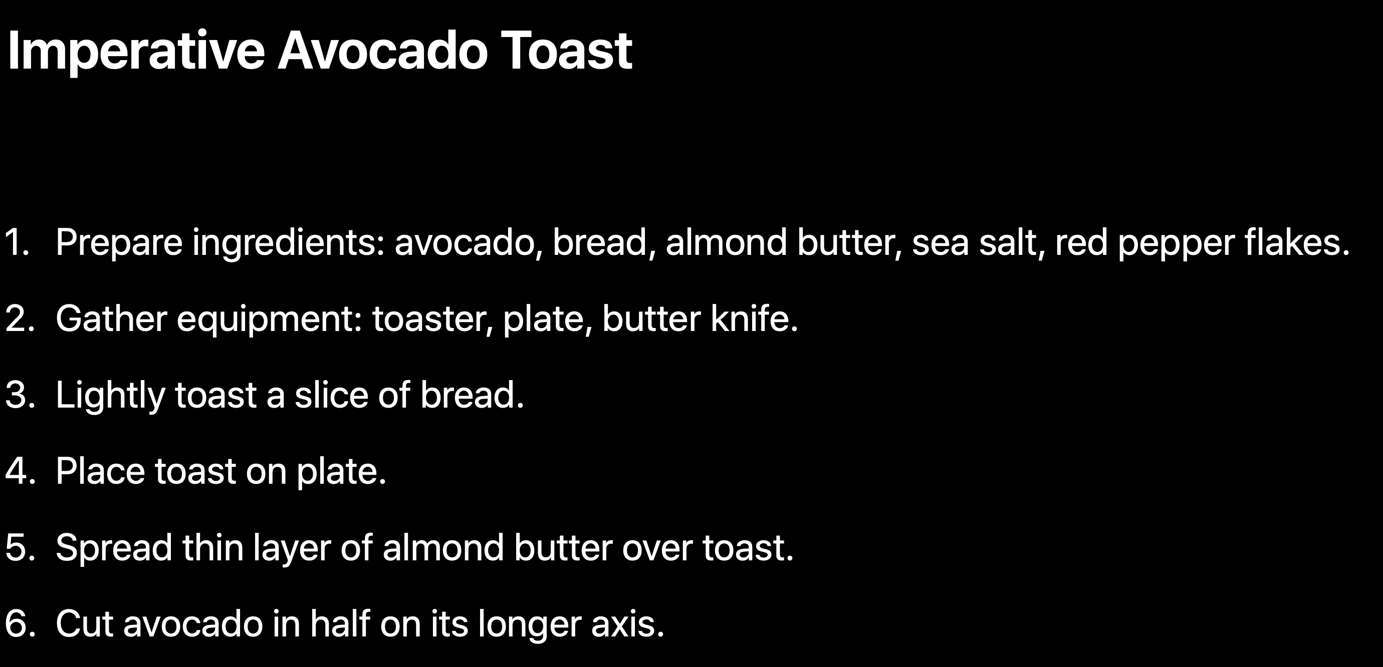 영상에선 아보카도 토스트를 만드는 방법에 대해서 명시적으로 나열한다.